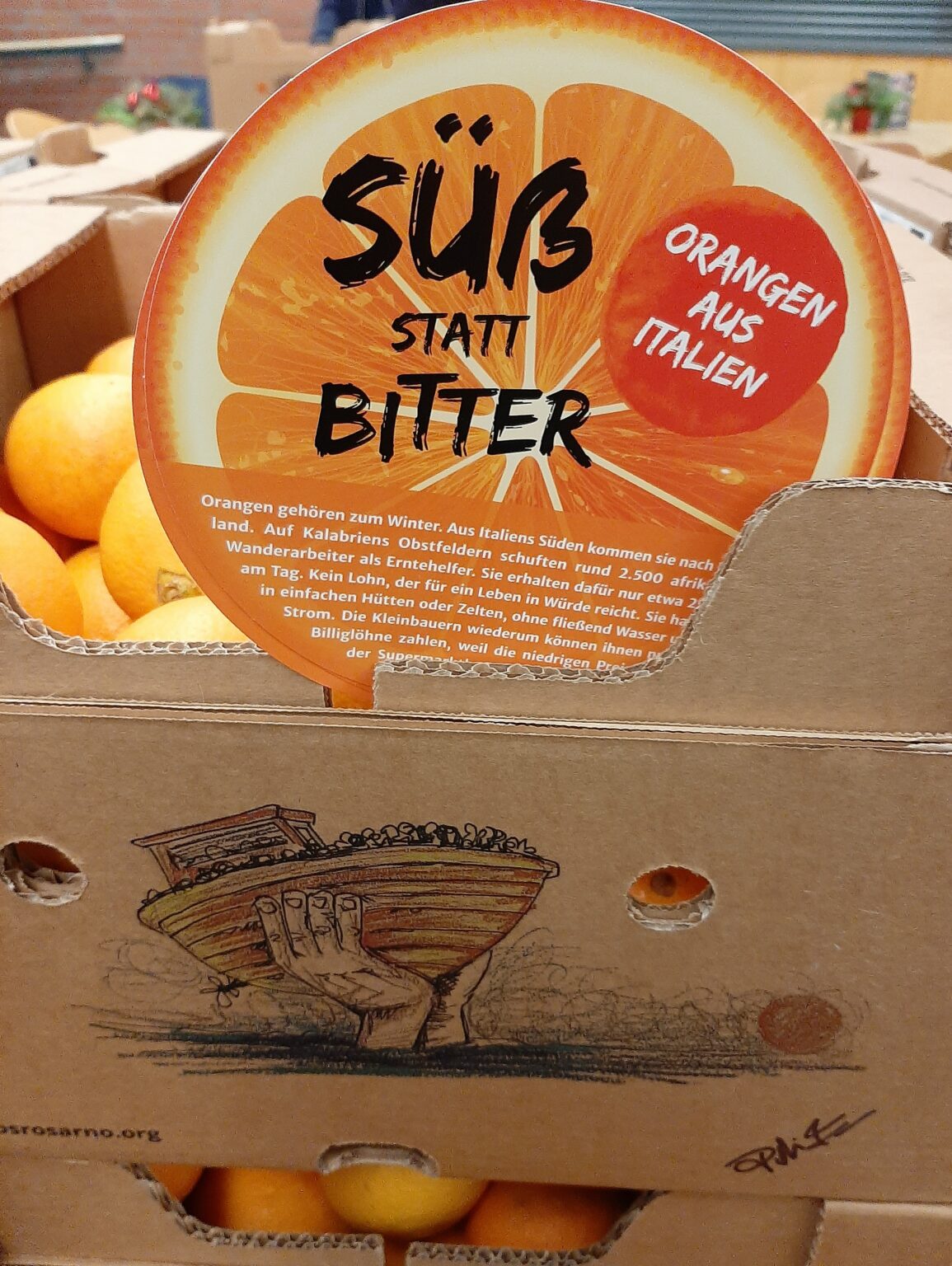 Nach dem großen Erfolg der letzten Orangenaktion im Dezember, bei dem der Spendenreinerlös an den gemeinnützigen Verein „SOS Rosarno“ ging, haben wir erneut Orangen und Clementinen aus Rosarno bestellt.