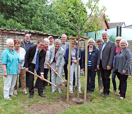 Bürgermeister Michael Dreier versprach der Gemeinde ein Apfelbäumchen. Es ist ein stattlicher Roter Boskoop, den er am 10. Juni gemeinsam mit Superintendentin Anke Schröder im Beisein vieler Gemeindeglieder pflanzte.