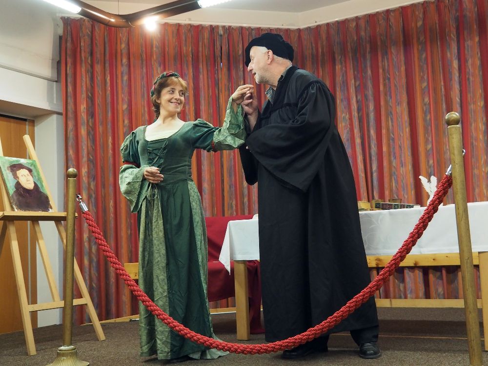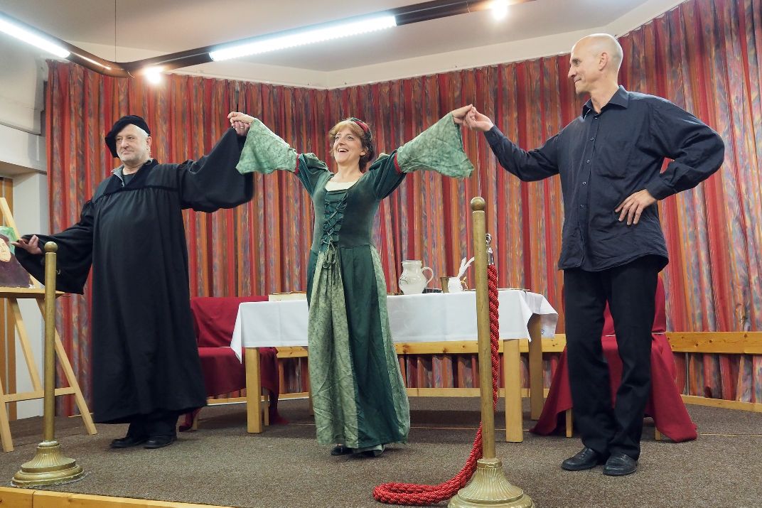 Das Ensemble Kolorit aus Zeitz (Kolorit steht für Konzert, Oper, Lyrik, Operette, Revue, Instrumental, Tanz) führte mit viel Schwung, Witz, Musik Spielfreude, aber auch mit nachdenklichen Tönen und ernsthaften Passagen in Luthers Leben und Wirken ein und ließ den Menschen Martin Luther und sein Umfeld lebendig werden.