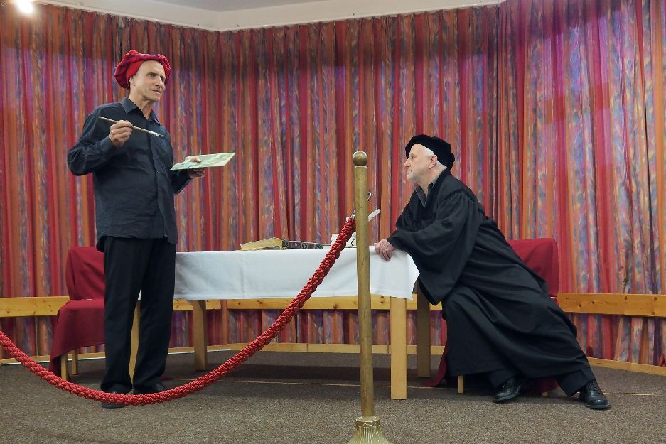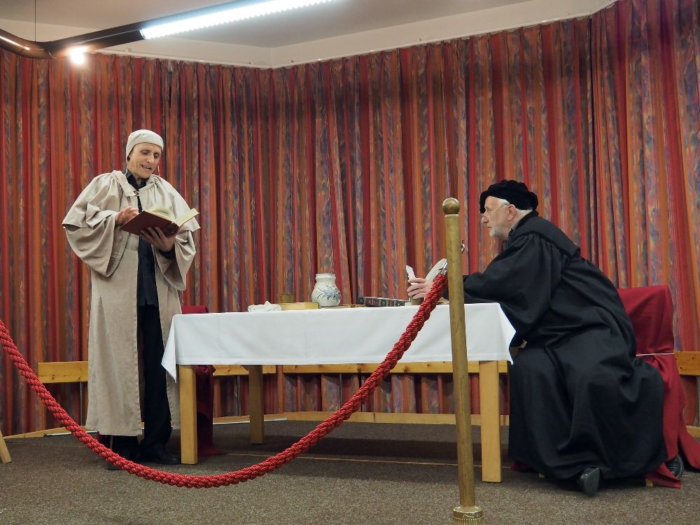 Als Museumsführer versetzte der Schauspieler Alexander Fabisch die Zuschauer nach Wittenberg. Unter dem Gelächter der Anwesenden erklärte er das Gemeindehaus zum Augustinerkloster und wies auf die originalgetreue Ausstattung der Lutherstube hin – die mit wenigen Requisiten ausgestattete Bühne im modernen Gebäude an der Elsner Urbanstraße. Fabisch agierte auch als Maler Lucas Cranach, der an Luthers Porträt arbeitete, und als Philipp Melanchthon, einem weiteren Freund und Mitstreiter Luthers. In ihren Gesprächen mit Luther wurden sowohl die Auseinandersatzungen mit der Amtskirche deutlich als auch sein Ringen um den rechten Weg zum Glauben und seine innere Zerrissenheit, die alltäglichen Sorgen sowie seine gesundheitlichen Probleme. Lucas Cranach war nicht nur Maler, sondern auch Apotheker und damit medizinischer Berater Luthers