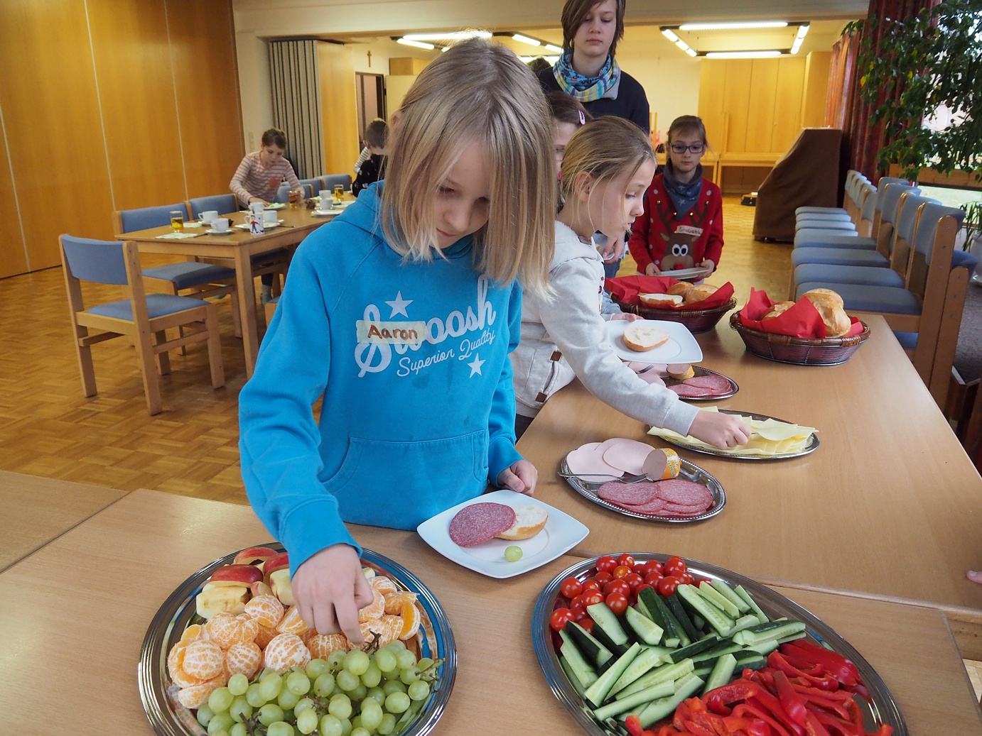 Zwölf Kinder folgten der Einladung und kamen im Gemeindehaus zusammen, um gemeinsam mit Teamerinnen aus der Jugendgruppe und einigen Erwachsenen einen fröhlichen Vormittag zu verbringen. „Heut' ist ein Tag, an dem ich singen kann“, so die Feststellung des Eingangsliedes. Außerdem natürlich tanzen und spielen. Zunächst aber wurde gefrühstückt, mit frischen Brötchen, Aufschnitt und anderen guten Sachen. Auch bei Rohkost, Obst und Müsli wurde kräftig zugelangt.