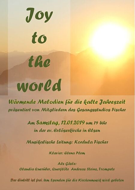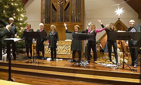 Ein kleines, aber feines Konzert bot die Musikschule Fischer aus Elsen zum Ausklang der weihnachtlich-festlichen Zeit am 13. Januar in unserer Erlöserkirche. Es musizierten acht Mitglieder der Gesangsklasse mit den Instrumentalisten Elena Plem am Klavier, Claudia Querüber an der Querflöte und Andreas Steins an der Trompete. Das schöne Programm mit raffiniert arrangierten Christmas Songs, zeitgenössischen Melodien und Liedern der klassischen Musikliteratur aus Barock und Romantik hatte die Musikpädagogin Kordula Fischer zusammengestellt, die das Konzert auch leitete.