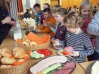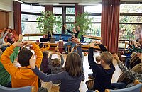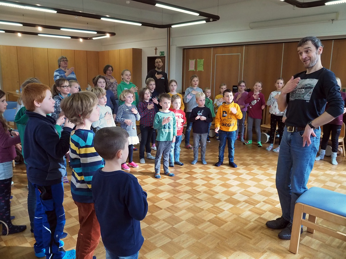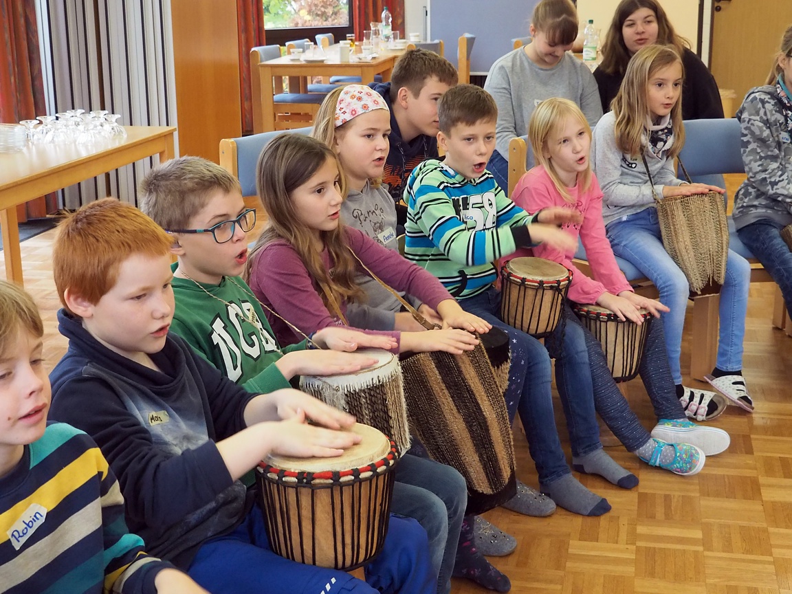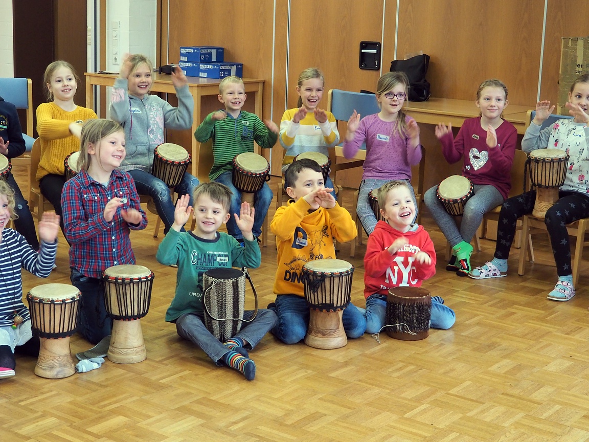 Afrikanische Musik bedeutet: singen, trommeln, tanzen. Mit einer richtigen afrikanischen Trommel macht das großen Spaß. Aber auch Konzentration war nötig, um genau nachzumachen, was „Cheftrommler“ Christoph vormachte – mal laut, mal leise.