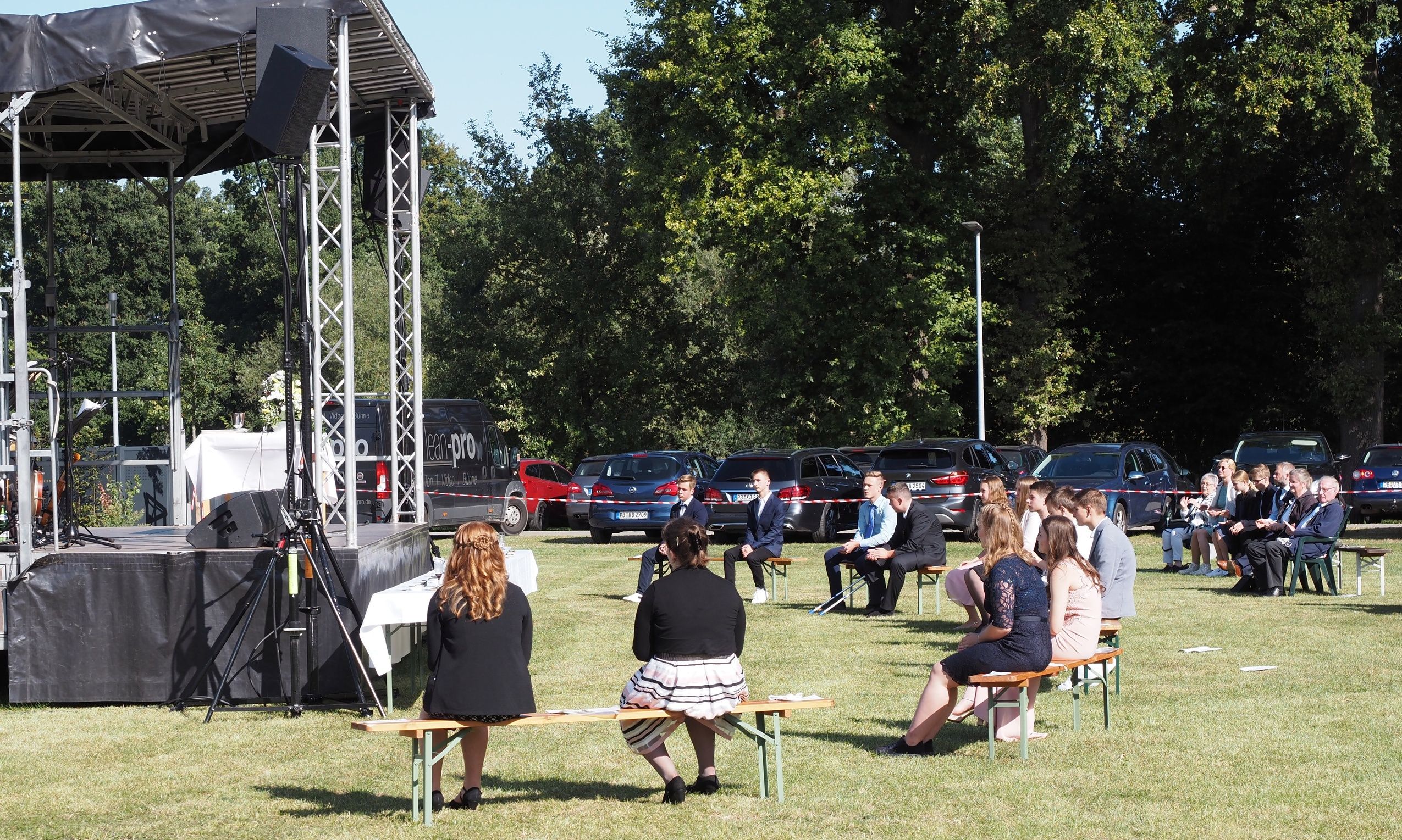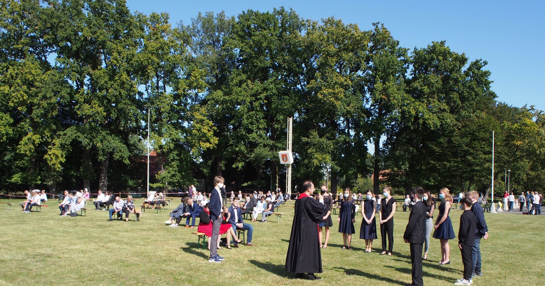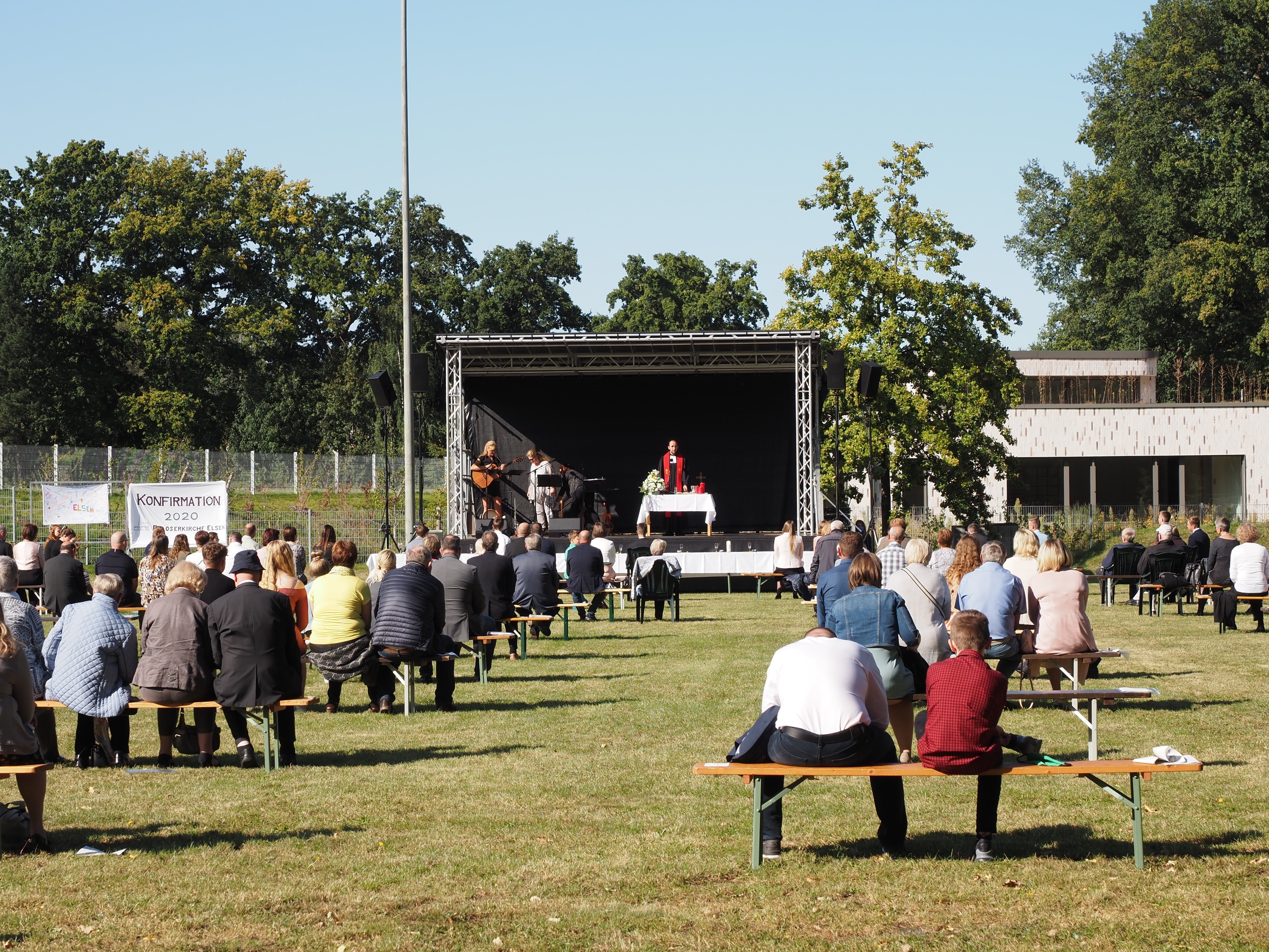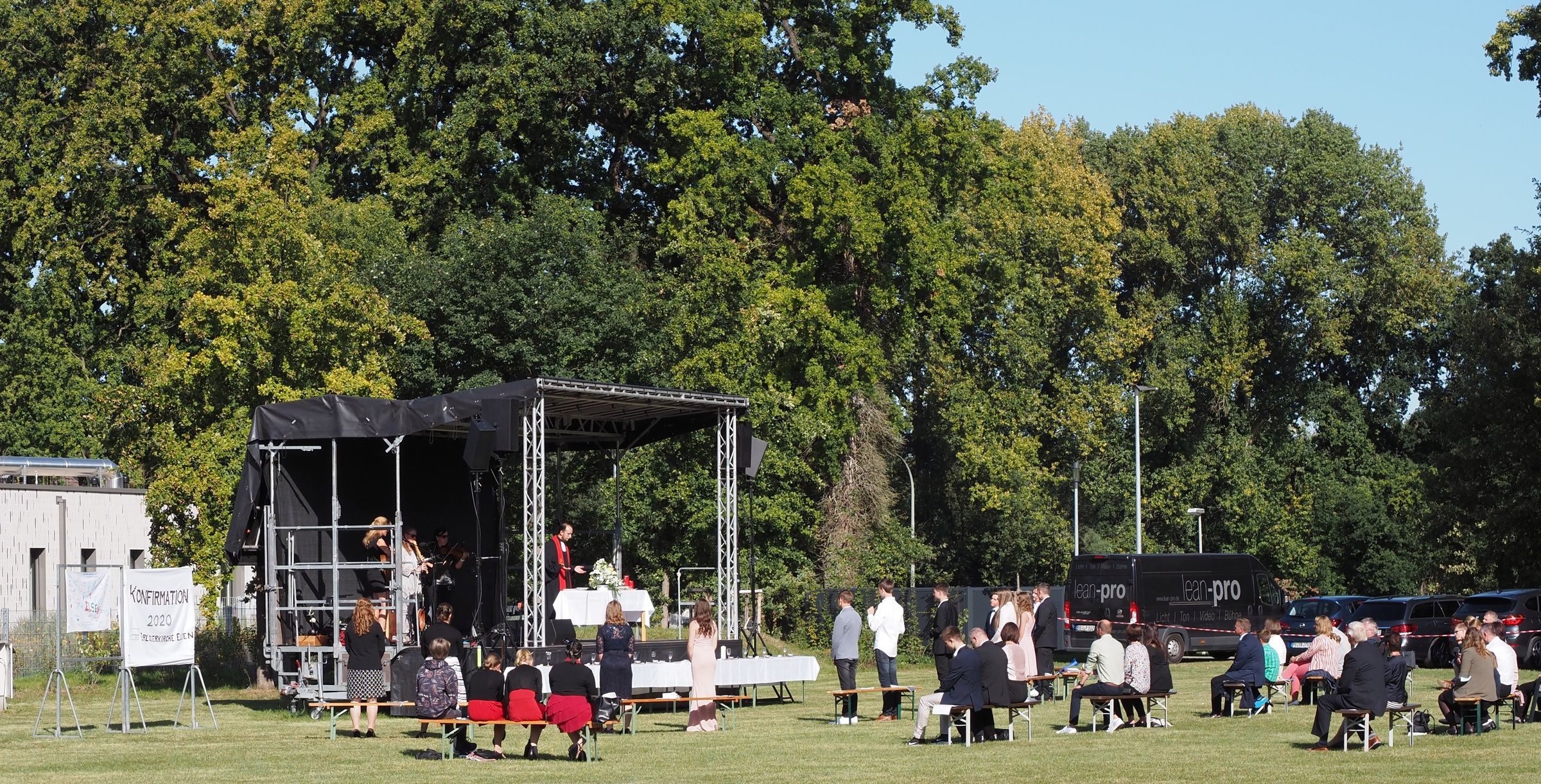 Unter Wahrung aller Vorgaben der Corona-Schutzbestimmungen konnten sich die Konfirmand*innen im Bogen vor der Bühne mit dem Altar versammeln. Die Gemeinde fand auf der Wiese Platz, obwohl ein Abstand von 4 m in „Gesangsausstoßrichtung“ ein-gehalten werden musste. Eine professionelle Beschallungsanlage sorgte dafür, dass die gesamte Gemeinde an den Gebeten, der Liturgie, der Predigt, den Ansprachen und der musikalischen Begleitung der Band „Arte Musica“ teilhaben konnte.