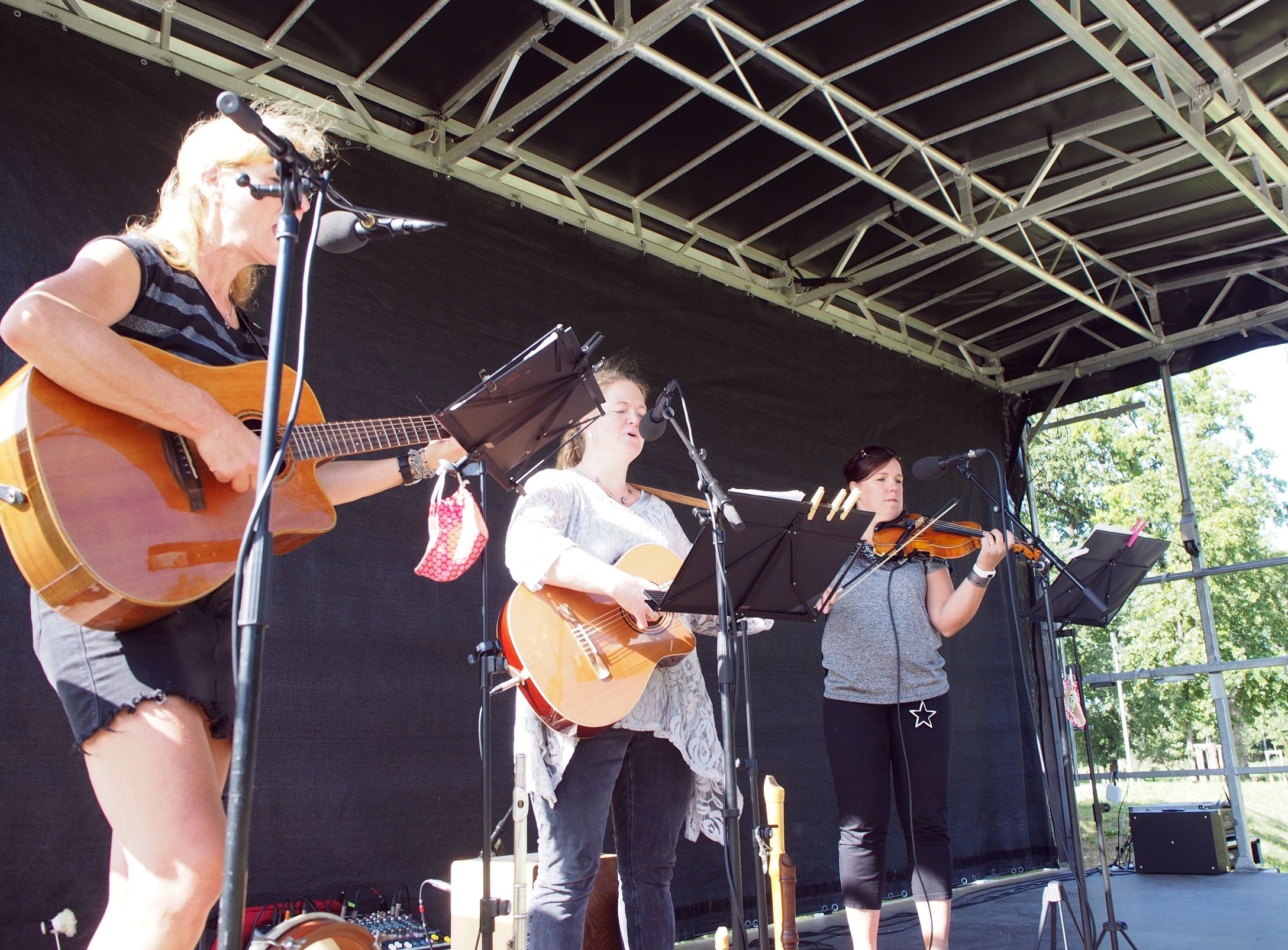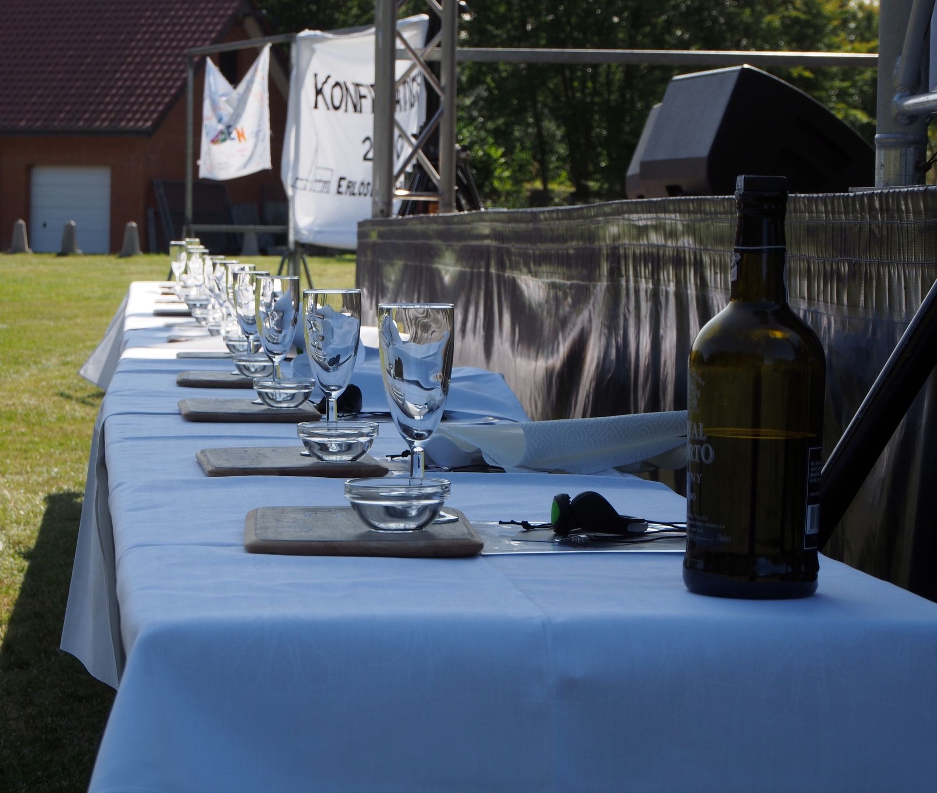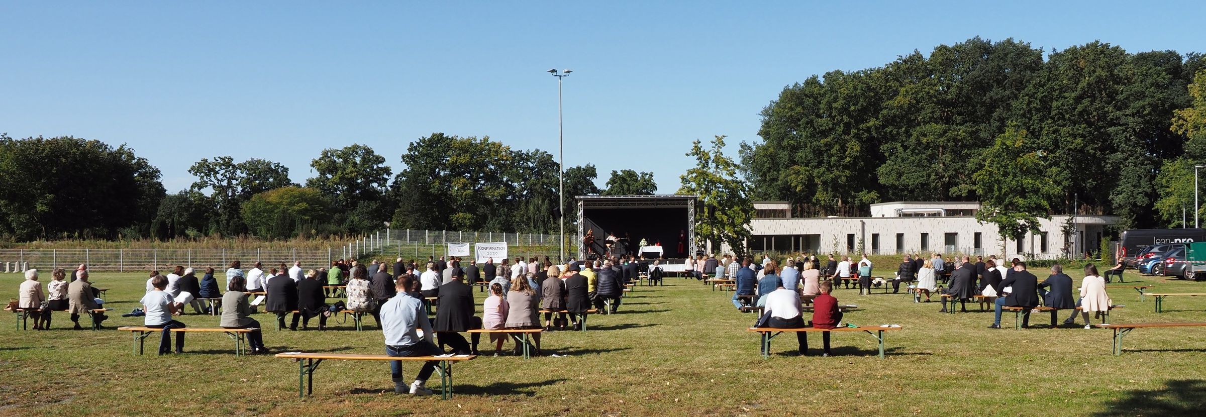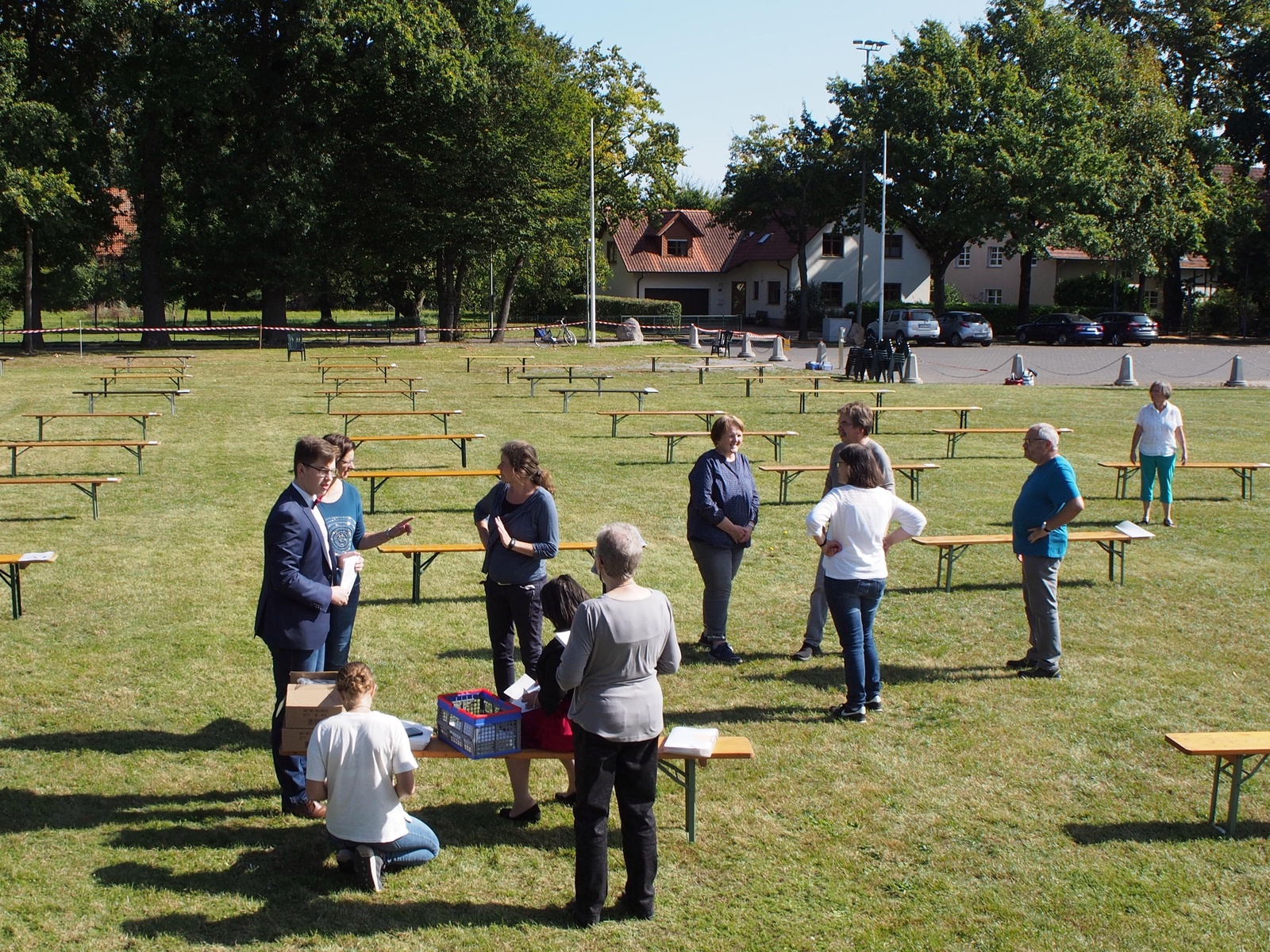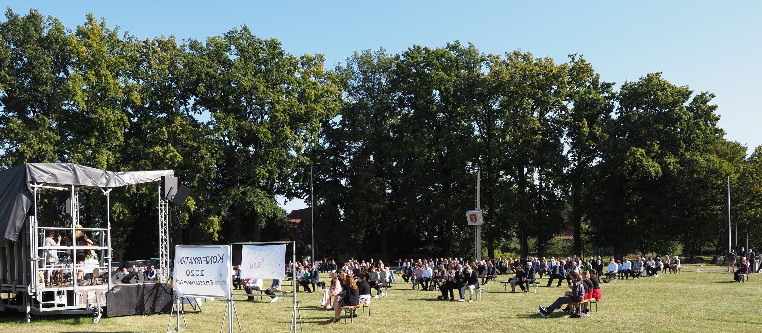 Unter Wahrung aller Vorgaben der Corona-Schutzbestimmungen konnten sich die Konfirmand*innen im Bogen vor der Bühne mit dem Altar versammeln. Die Gemeinde fand auf der Wiese Platz, obwohl ein Abstand von 4 m in „Gesangsausstoßrichtung“ ein-gehalten werden musste. Eine professionelle Beschallungsanlage sorgte dafür, dass die gesamte Gemeinde an den Gebeten, der Liturgie, der Predigt, den Ansprachen und der musikalischen Begleitung der Band „Arte Musica“ teilhaben konnte.