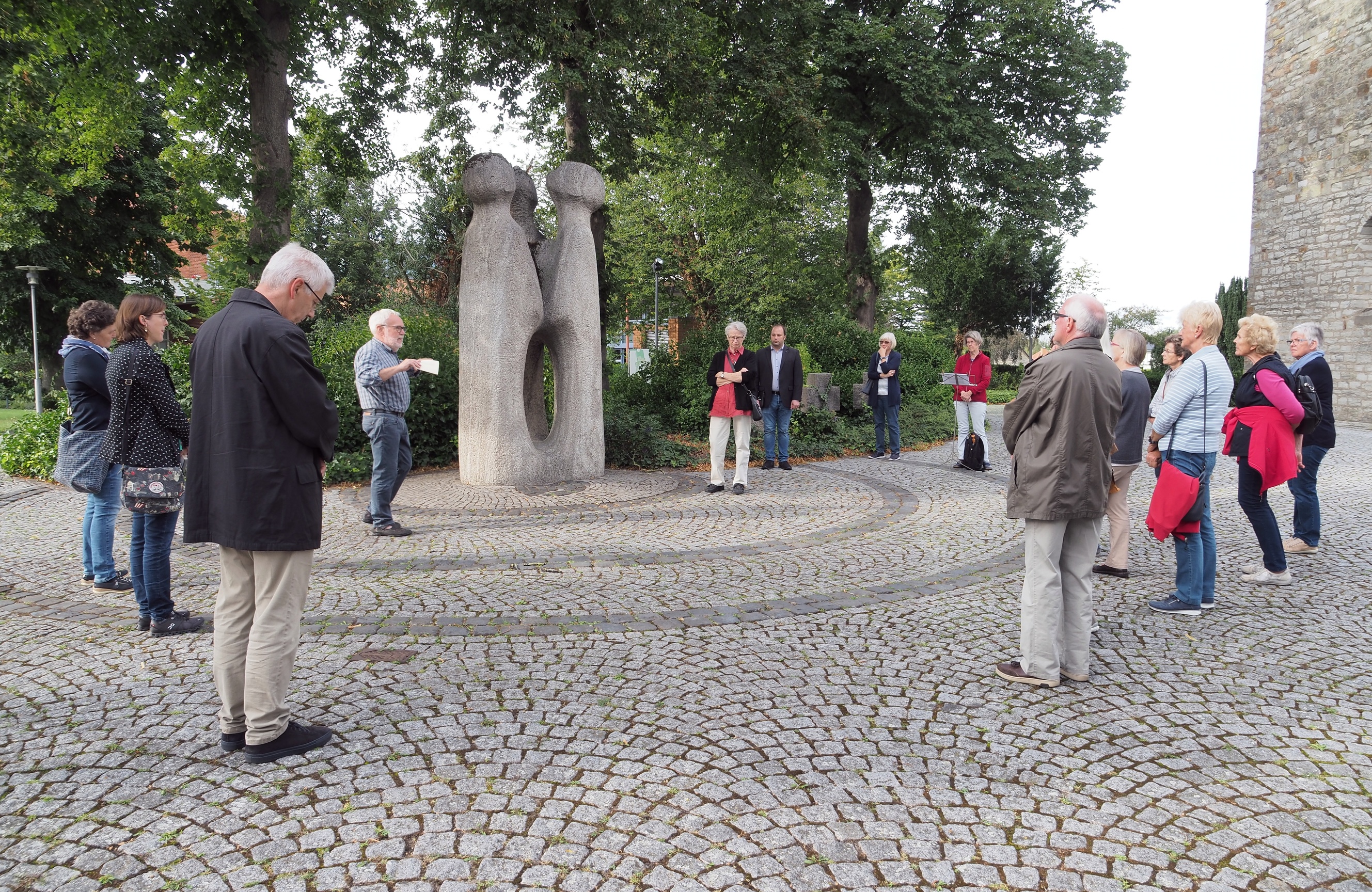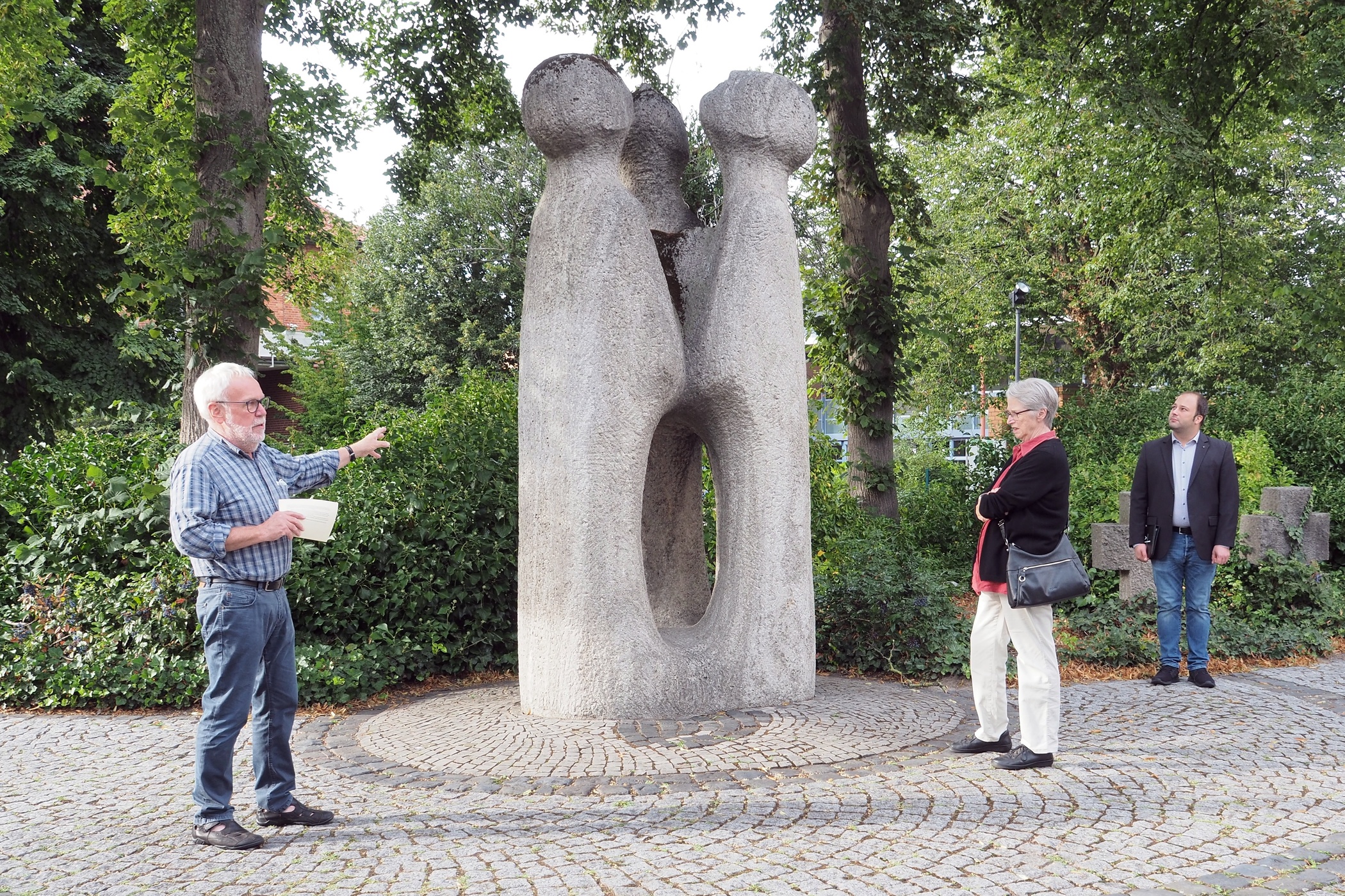 Die Skulptur von Richard Sehrbrock auf dem Vorplatz der Dionysius-Kirche zeigt drei Menschen, die (staunend?, fragend?) zum Himmel sehen. Sehrbrock griff mit seinem Werk Vers 11 aus dem 1. Kapitel der Apostelgeschichte auf, wo die JüngerInnen Jesu Auffahrt zum Vater erleben und nun mit ihren Fragen, Sorgen und Aufgaben auf sich gestellt sind. Woher erwarten sie Hilfe, Rat, Motivation, überhaupt: Grund für die so lebensnotwendige Hoffnung? Die Szene von damals vor knapp 2000 Jahren ist immer noch aktuell: Woher erwarten Menschen heute Grund und Anlass zu Hoffnung? Diakon Theo Breul lud zu einem Schnelldurchgang durch aktuelle Präsentationsformen des Zeitgeists ein. Der Rat von Friedrich Nietzsche „Brüder, bleibt der Erde treu!“, sei gar nicht so verkehrt, obwohl er schon über 130 Jahre alt ist: ChristInnen sollen die Welt gestalten, für alle Menschen bewohnbar machen. Glaube zeigt sich auch im konkreten Leben und Handeln.