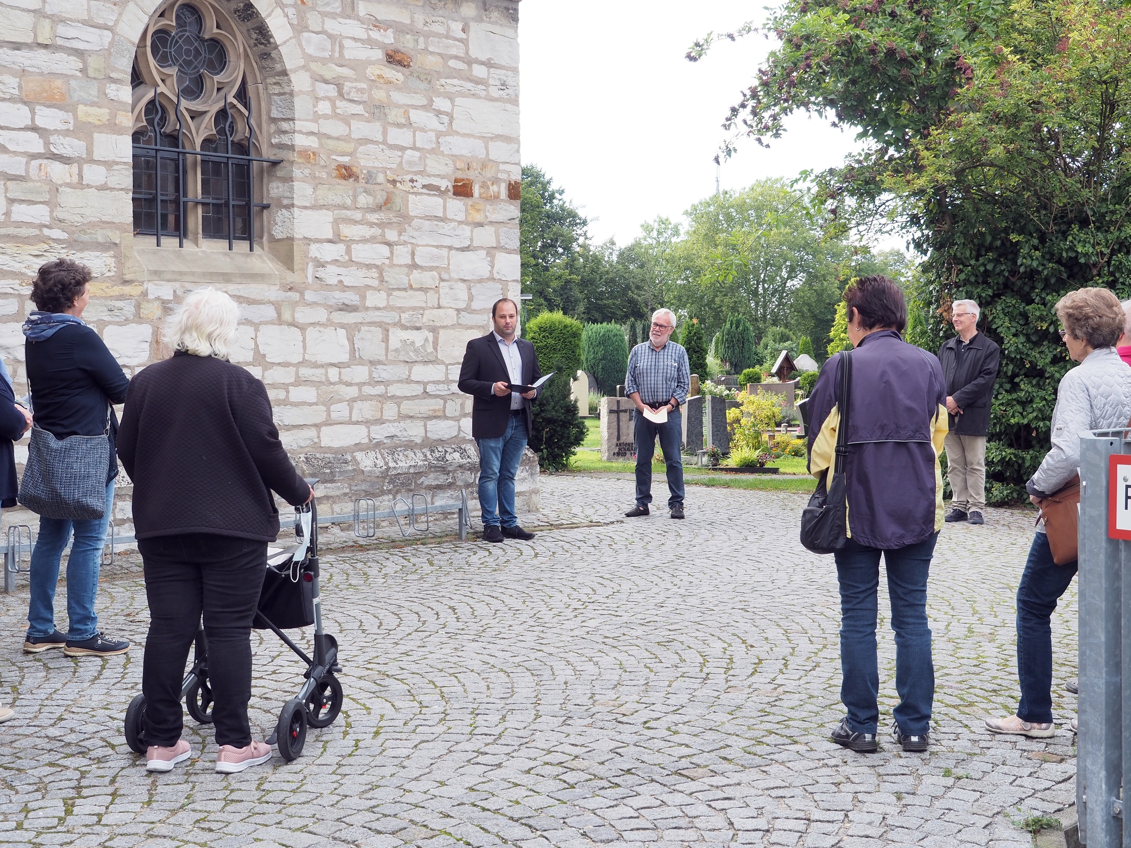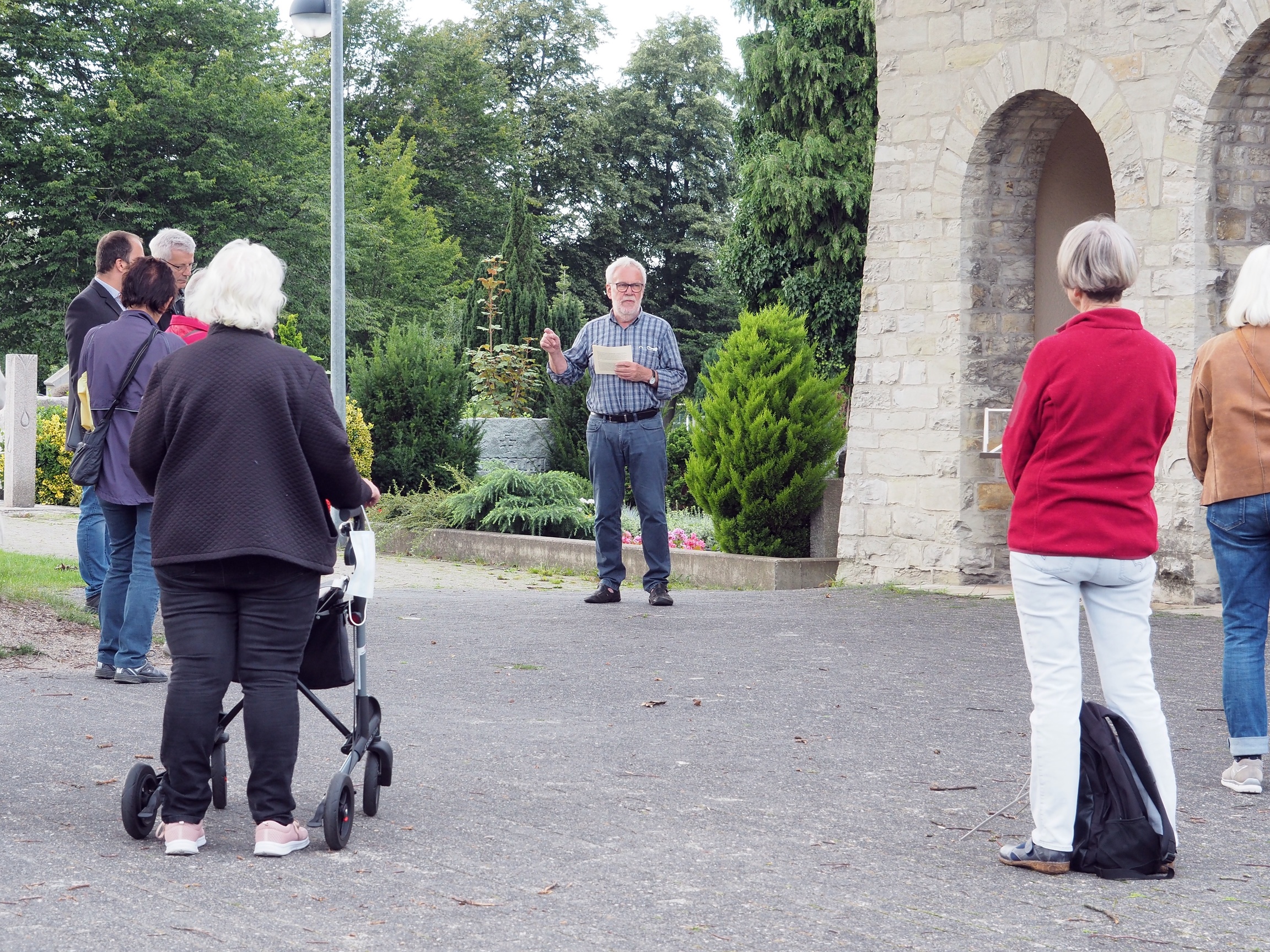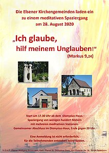 In diesem Jahr war alles anders als gewohnt. Der als Wanderung geplante ökumenische Pilgerweg wurde auf einen Spaziergang um die Dionysiuskirche herum reduziert. Keine gemeinsame Anreise per Bus zu einem Ort, von dem aus man, wie es sich fürs Pilgern eigentlich gehört, auf fremder Scholle wandern und bisher Unbekanntes kennenlernen konnte. Und manche, die gerne teilgenommen hätten, blieben wegen der Corona-Pandemie denn doch wohl lieber zu Hause. So konnte Gisela Appelbaum vom Elsener Pfarrgemeinderat gerade mal gut 20 Teilnehmende am frühen Abend des 28. August vor dem Dionysius-Haus im Namen der evangelischen und der katholischen Kirchengemeinde begrüßen.