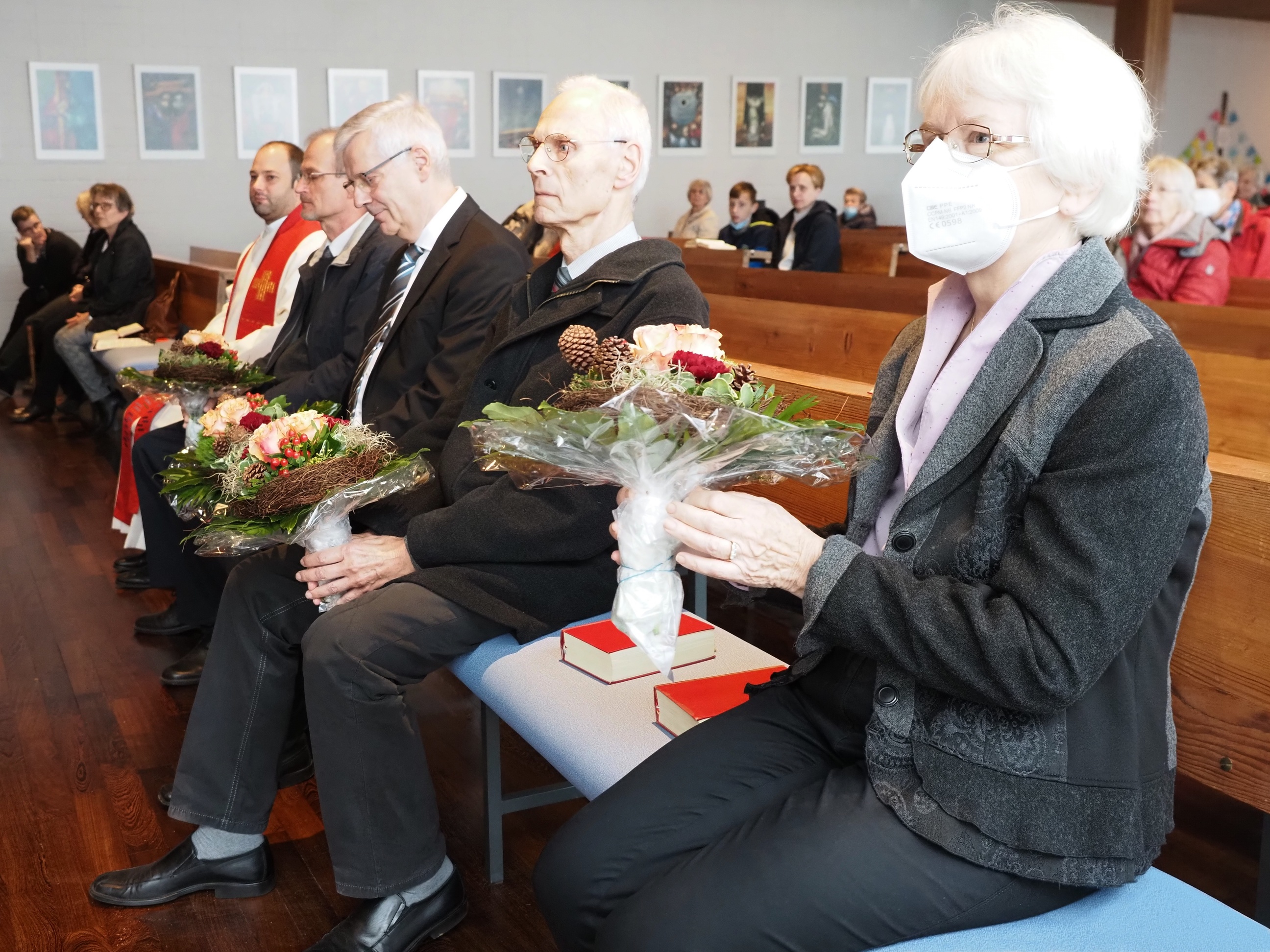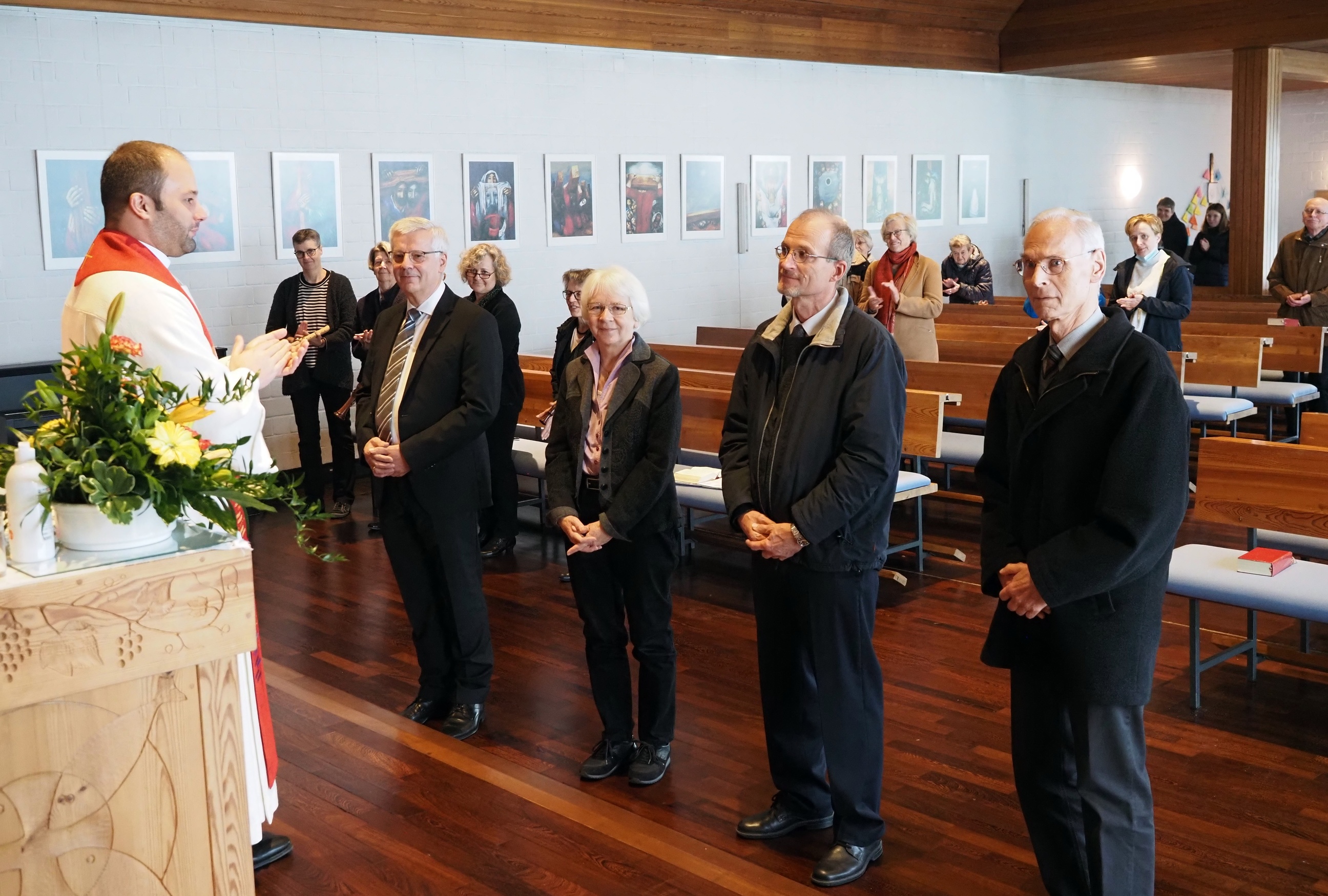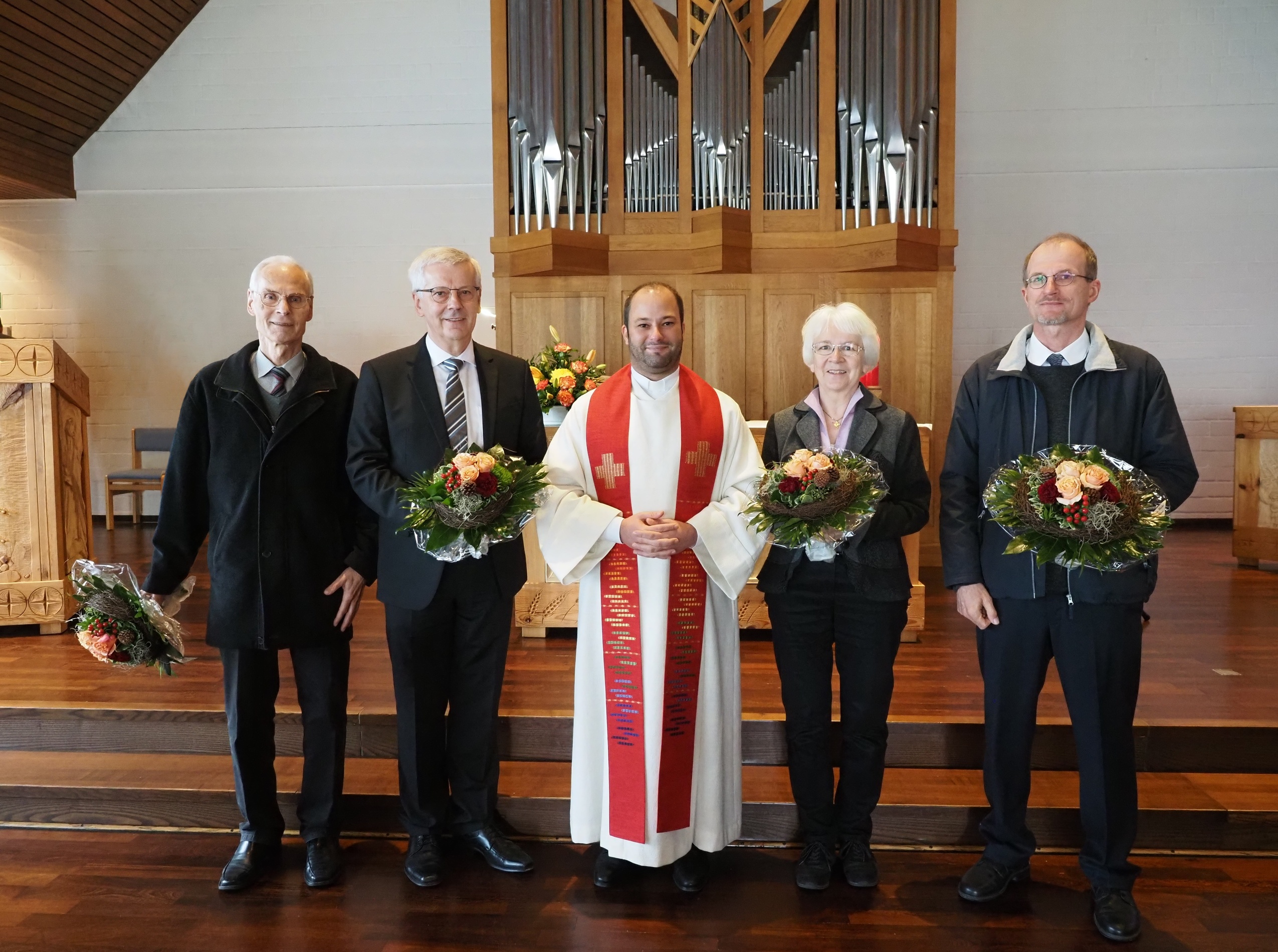 Im März vorigen Jahres sollten die neuen Presbyter:innen in einem Gottesdienst eingeführt und die aus dem Amt ausscheidenden entpflichtet werden. Durch die Corona-Pandemie war das nicht möglich. Die Verpflichtung des derzeitigen Presbyteriums erfolgte schriftlich. Die Entpflichtung von Jürgen Scherhans, Klaus Wiemann, Irene Glaschick und Wolfgang Bermpohl (im Bild von li. nach re.) sollte nicht so formlos stattfinden und konnte nun endlich in einem festlichen Gottesdienst am 7. November begangen werden. Pfarrer Faisca Martins dankte ihnen mit herzlichen Worten für viele Jahre des Dienstes für die Gemeinde und segnete sie: „Gott segne euren Blick zurück und eure Schritte nach vorn. Er bewahre euch die Erfahrungen an diesem Ort und begleite euch auf den Wegen, die vor euch liegen.“ Im Anschluss gab es einen Empfang im Gemeindehaus.