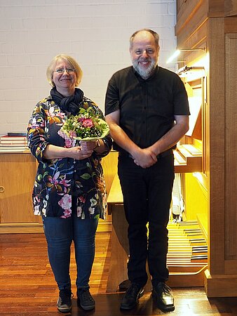Das Publikum dankte Thomas Schulze-Athens mit begeistertem Applaus. Frau Ikenmeyer als stellvertretende Vorsitzende des Presbyteriums überreichte einen guten Wein sowie einen Blumenstrauß für Frau Schulze, die „alle Register gezogen hat“. Das Schlusswort unseres Organisten „Auf ein Neues“ lässt hoffen, dass wir auf ein weiteres Konzert nicht bis zur nächsten Orgelrenovierung warten müssen. Danke, lieber Herr Schulze-Athens, für diesen schönen Konzertabend!