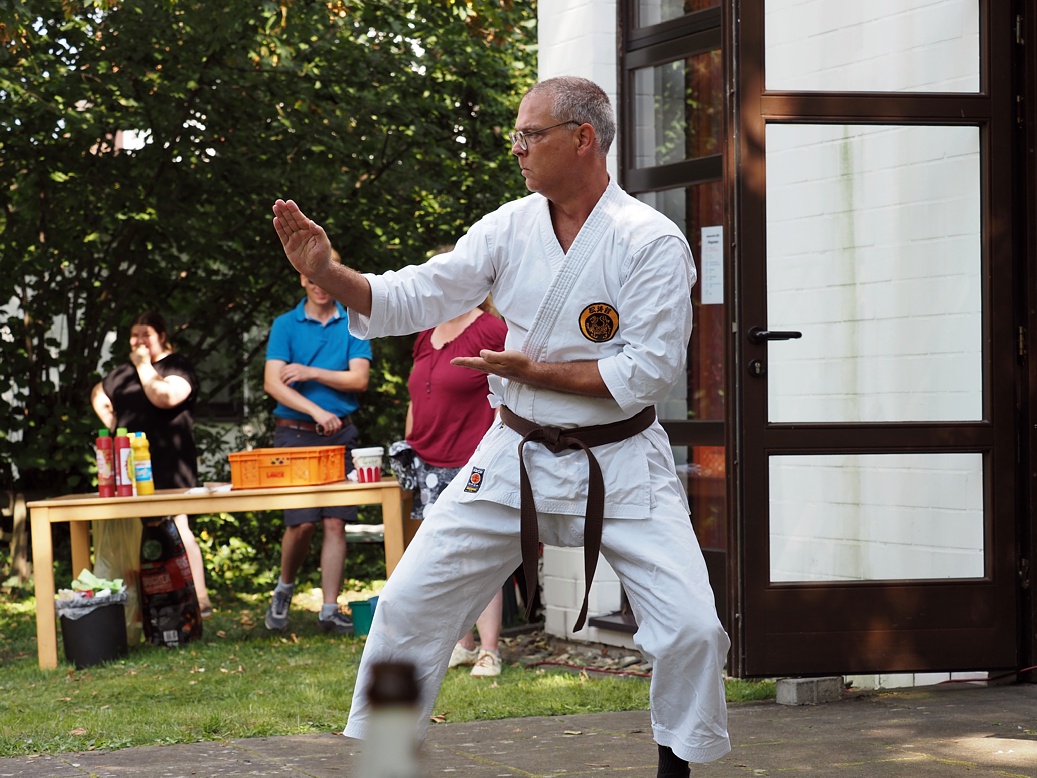 Danach ging es in den Garten. Das Wetter spielte mit: sonnig, aber nicht zu warm. Es gab Grillwurst und Brötchen, dazu diverse Kaltgetränke. Die Kuchentheke am Nachmittag bot eine reichhaltige Auswahl. Die Bezahlung ohne festgelegte Preise, ohne Wertmarken hat sich bewährt – jede:r spendete nach Belieben.