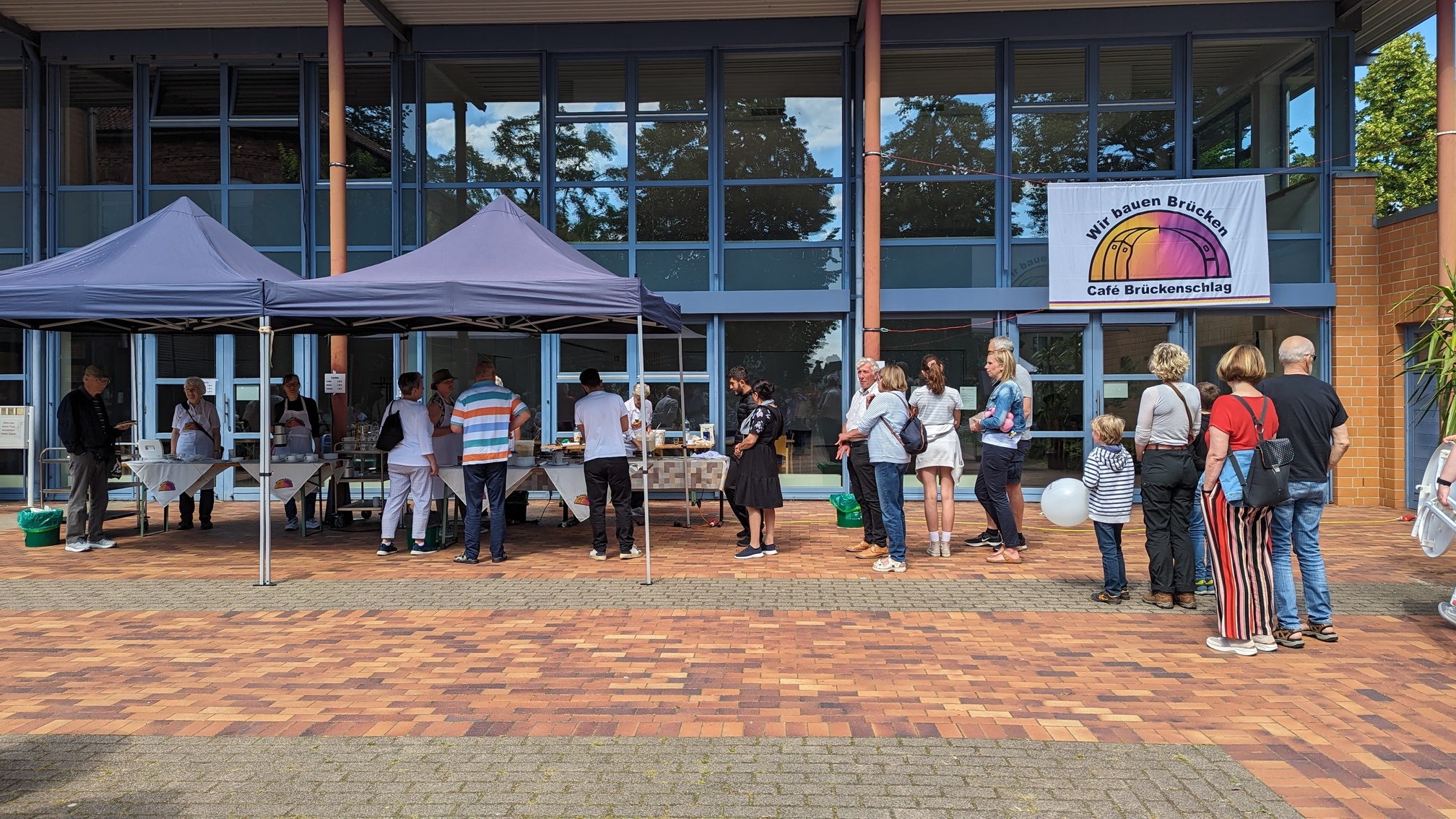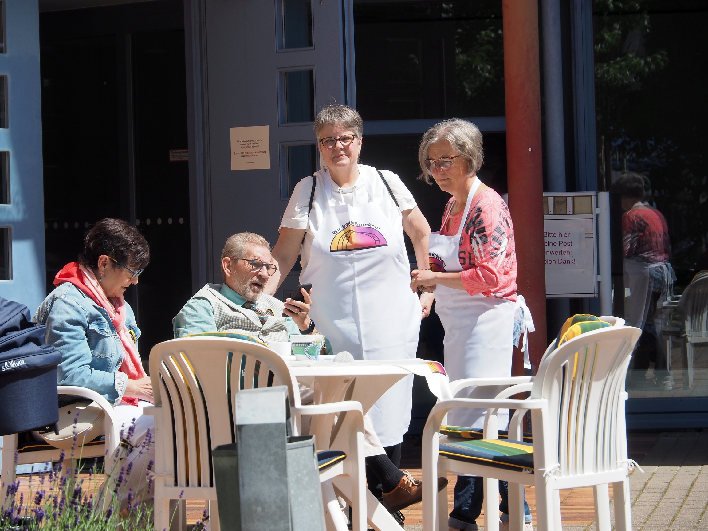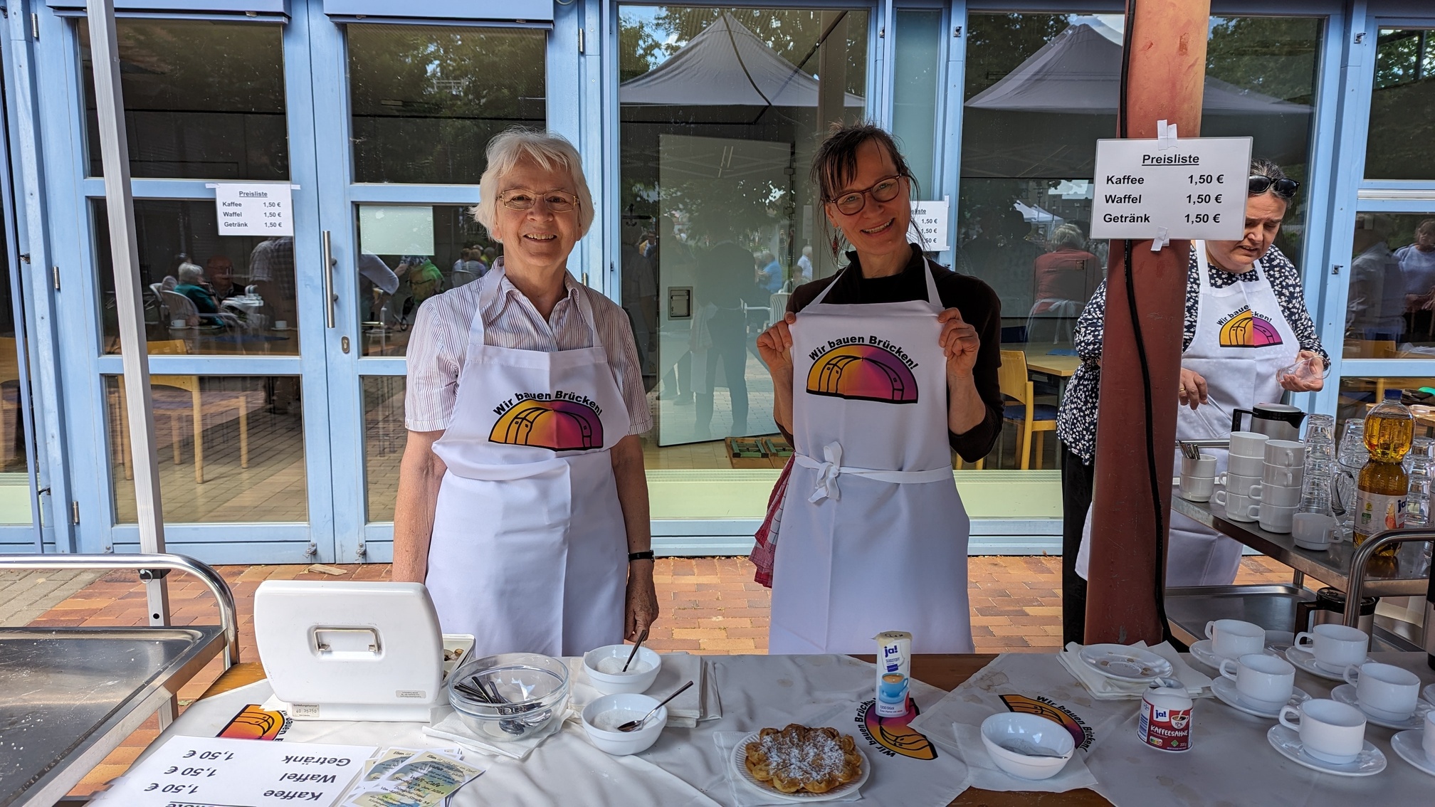 Vor dem Dionysiushaus gab es wieder das Café Brückenschlag. Ca. 40 Helfer:innen sorgten für Auf- und Abbau und dafür, dass immer frische Waffeln, Kaffee und Kaltgetränke da waren. Der Küchendienst ermöglichte reibungslosen Nachschub.