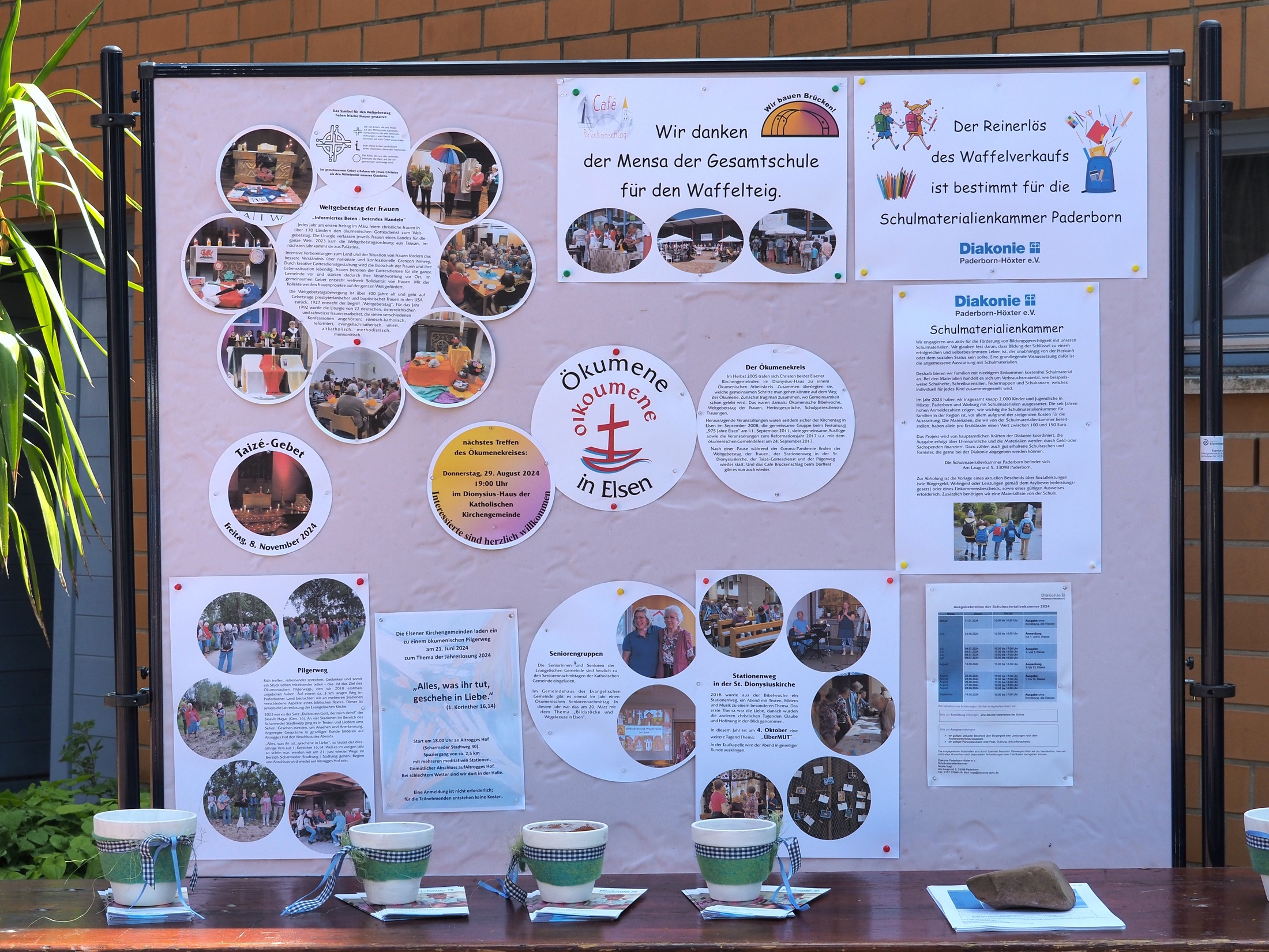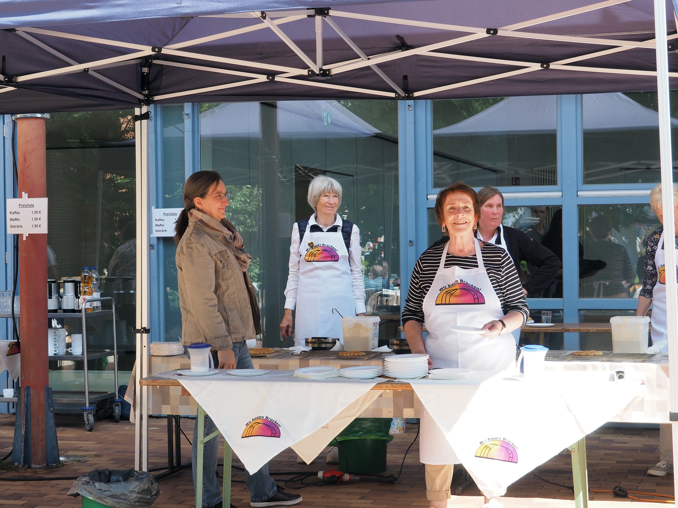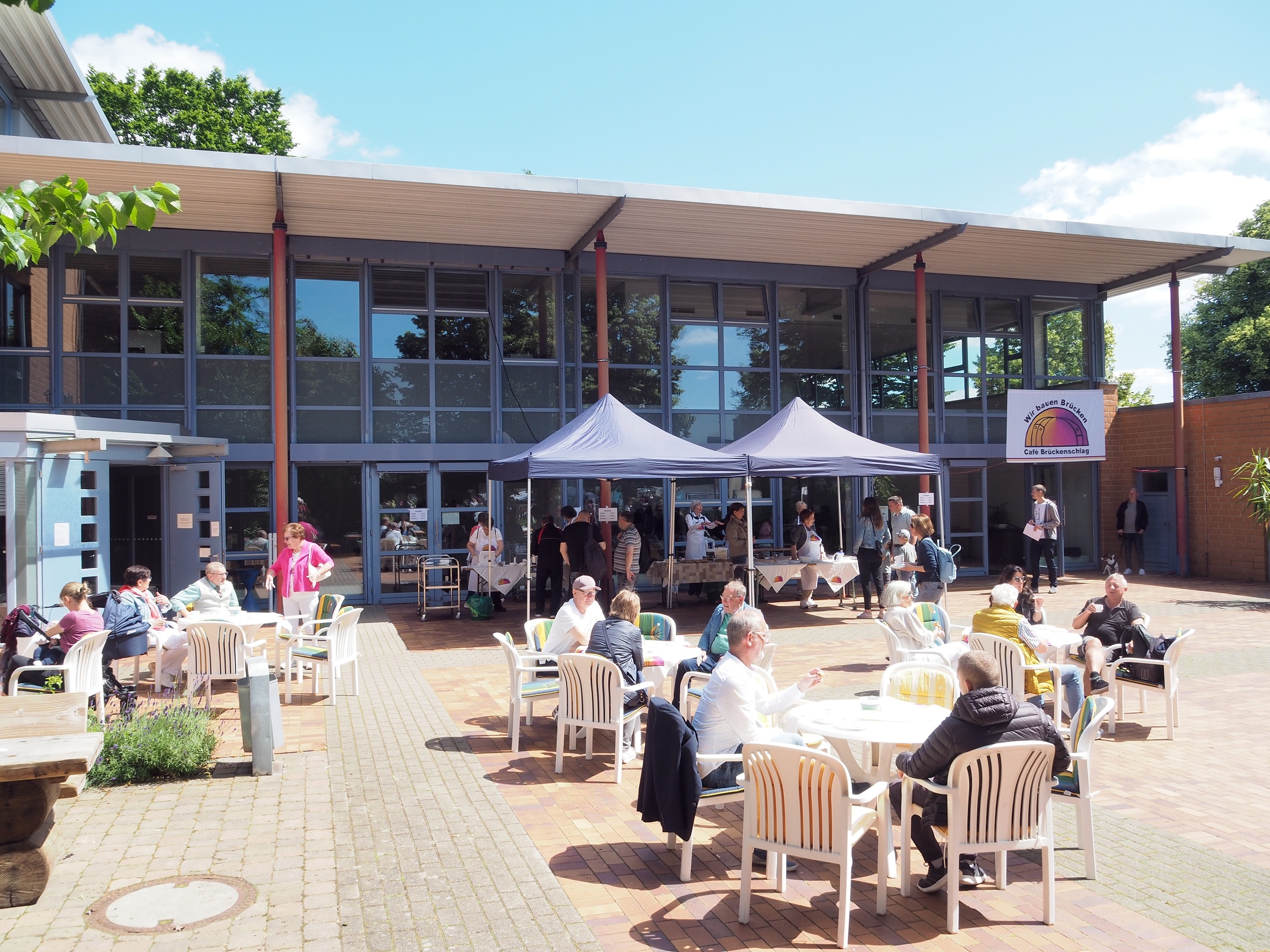 Vor dem Dionysiushaus gab es wieder das Café Brückenschlag. Ca. 40 Helfer:innen sorgten für Auf- und Abbau und dafür, dass immer frische Waffeln, Kaffee und Kaltgetränke da waren. Der Küchendienst ermöglichte reibungslosen Nachschub.
