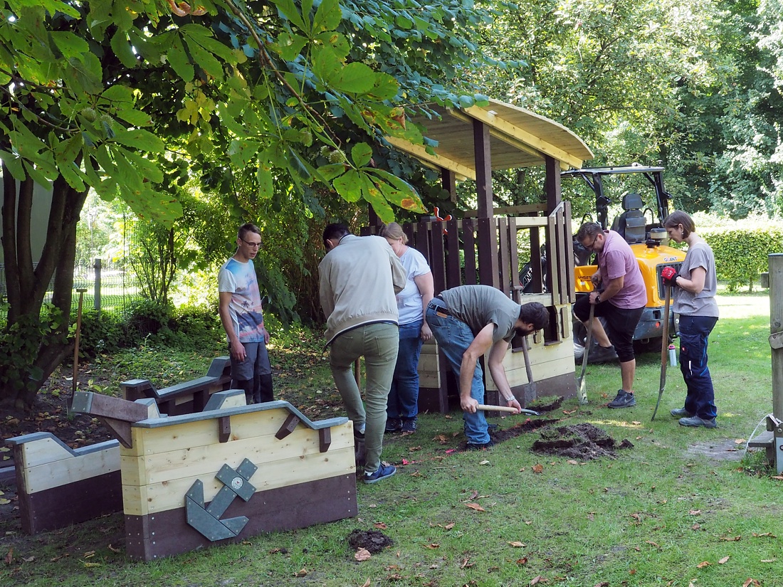 Im vorletzten Gemeindebrief hatte der Förderkreis unserer Kita um Spenden gebeten, damit zwei neue Archen auf dem Außengelände errichtet werden können. Eine große Arche konnte nun finanziert werden und wurde Anfang September mit tatkräftiger Hilfe einiger Eltern aufgebaut. Kinder der Kita und ihre Erzieherinnen verfolgten gespannt, wie die Fundamentlöcher ausgehoben und mit Betonestrich ausgegossen wurden, die Arche ausgerichtet und zusammengeschraubt wurde. Anschließend stürmten die Kinder gleich los, um sie zu entern.